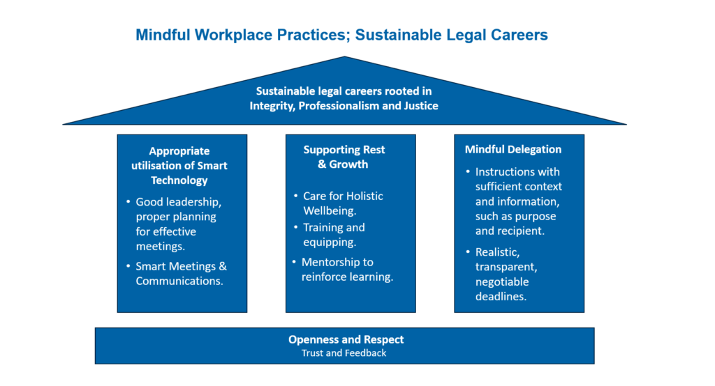 The Sustainability Principles are built on three pillars — Appropriate utilisation of Smart Technology, Supporting Rest and Growth, and Mindful Delegation — and underpinned by the values of Openness and Respect. We hope they serve as a shared reference point as the profession continues shaping sustainable and fulfilling legal careers.